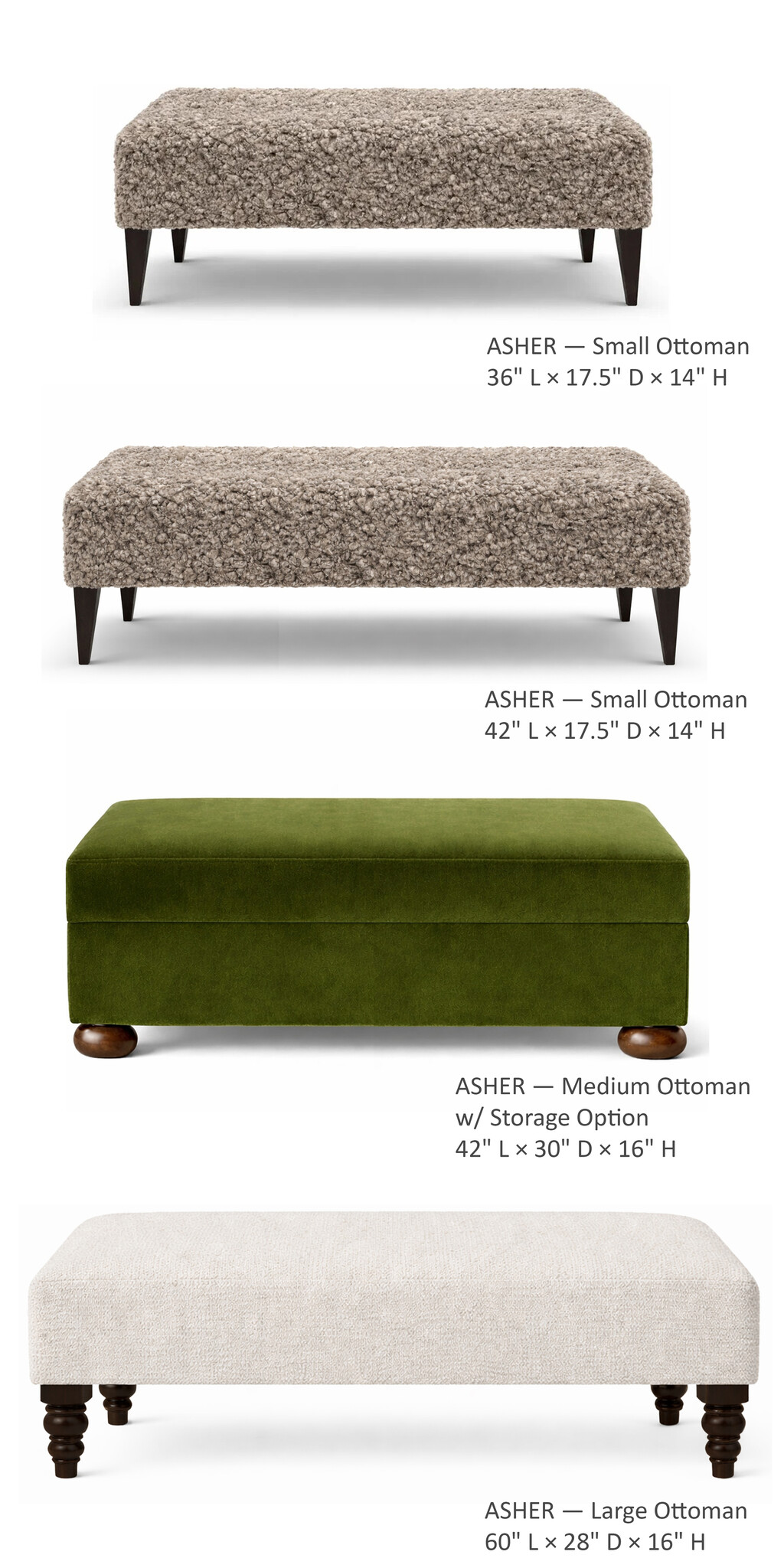 The Asher Ottoman is made to order and tailored to your space. Choose your preferred dimensions, upholstery, and leg style to create a piece that fits seamlessly into your home. Optional concealed storage is available for added functionality without compromising the clean, modern profile.